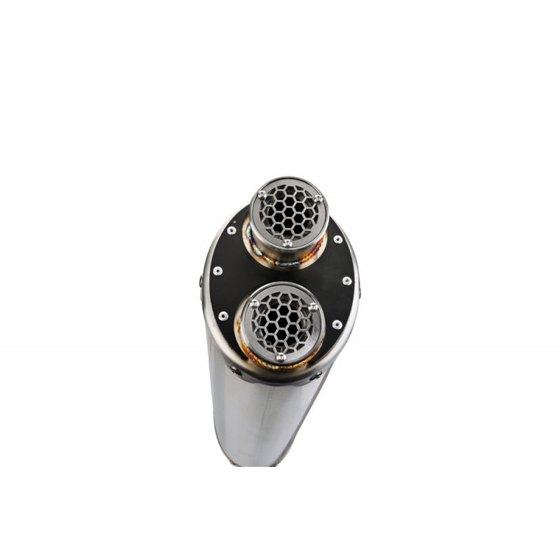 Terminale DUAL INOX, realizzato con corpo in acciaio inox 304 e fondello con doppia uscita, doppio beccuccio di scarico,forma ellittica 100x130, dedicato alle moto enduro e gran turismo.
