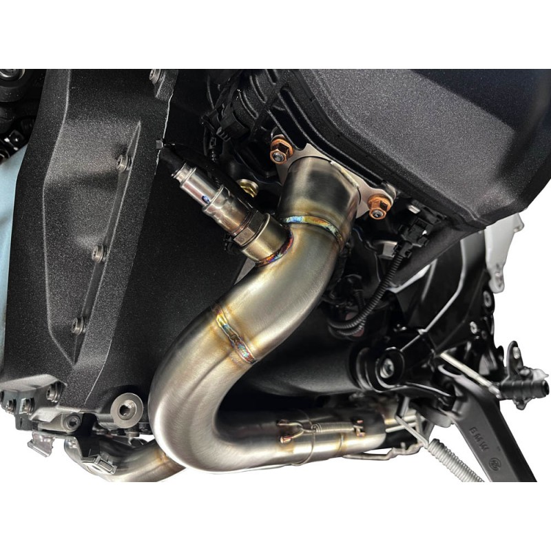 Collettore decatalizzatore integralmente in titanio con saldature a vista TIG, garantisce un risparmio di peso di un terzo rispetto all'originale e si abbina anche al terminale d'origine, il catalizzatore viene eliminato per massimizzare le prestazioni, il che comporta l'impossibilità di utilizzo per revisioni